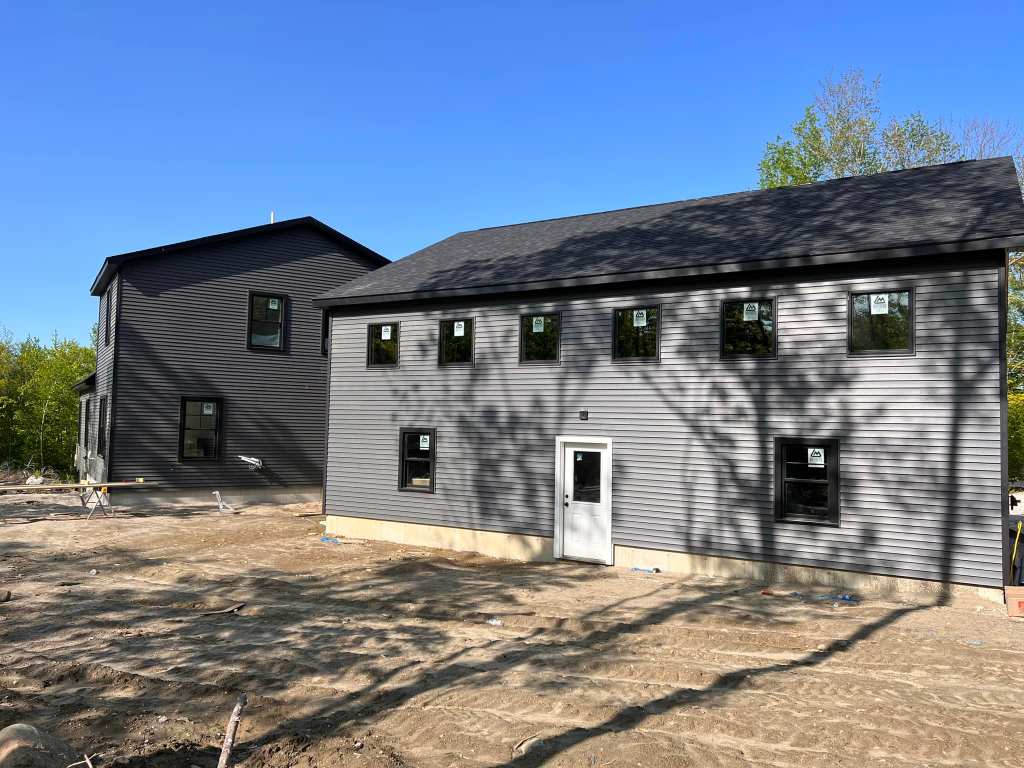 Our home in difference phases and views. We cleared a lot of land this summer and graded the slopes to keep water away from the foundation. We have perimeter drains, but with a stream by the house we did not want to take our chances. We sloped the land towards the right of these photos where we plan to have a pond and natural feeding area for wildlife.