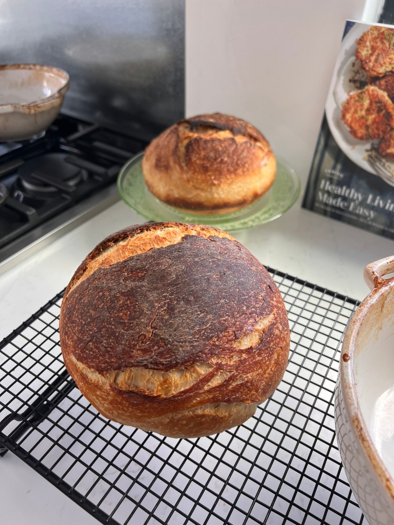 This loaf is cooling so I cannot cut into it for a few hours. I am eager to cut both loaves to compare the crumb. Right off the front loaf is a perfectly round shape where the traditional mixed loaf took a looser form.
